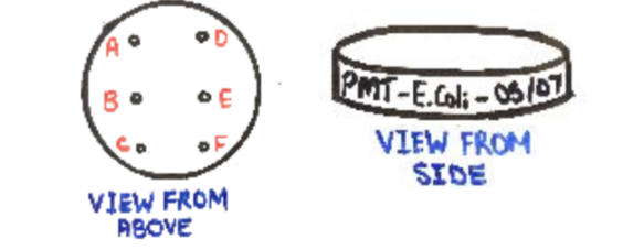 evenly across the plate 6 letters A-F to show where to place the different antibiotic discs.